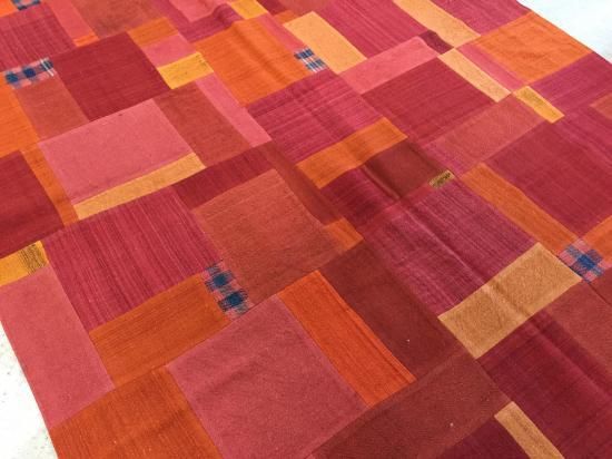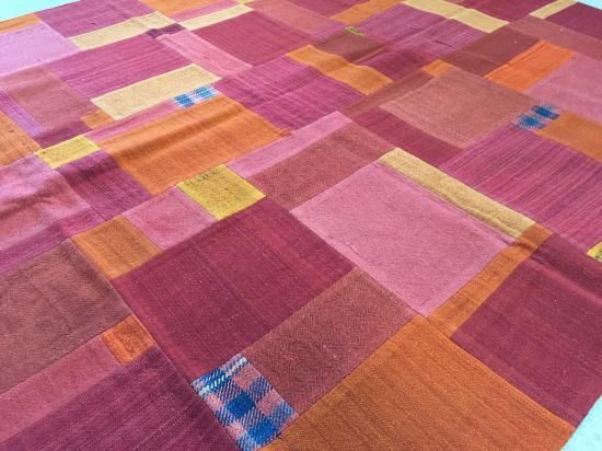 草木染にした薄手のキリムをパッチワークにしています。タペストリーとして壁に掛けても素敵です。裏は厚手のコットン地をつけてありますので、もちろんラグとしてもお使いいただけます。