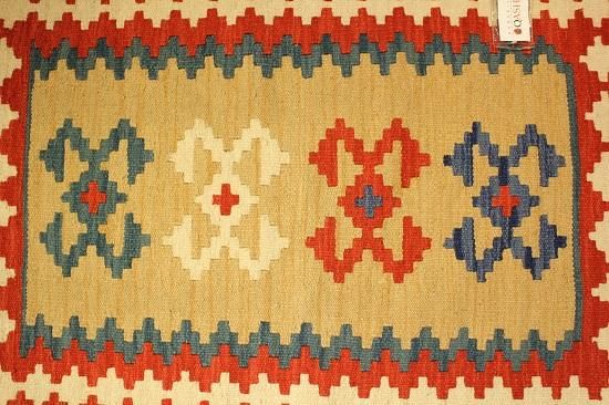イランカシュガイ族が草木染・手織りで織り上げる平織のキリムです。遊牧民にとってキリムは穀物袋やラクダの背中に乗せる袋など生活用具を作る生地としての役割があり、家族の幸せを願うデザインが施されています。