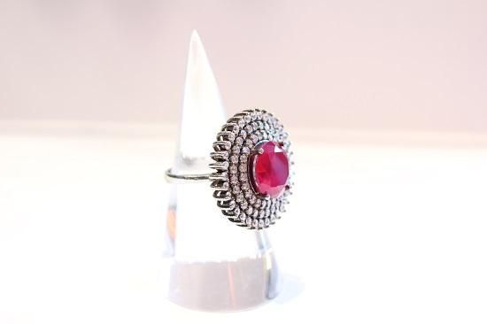 直径約13mm大きなスピネルとキュビックジルコニアを踏んだんに使ったリングです。とてもゴージャスなので、ディナーや、パーティのお供にいかがでしょう。