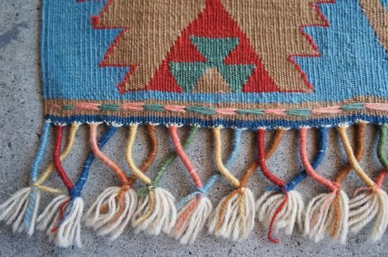 【お手入】 普段のお手入れは掃除機をかけるだけで十分です。また、天気の良い場所に干したり、敷き場所や方向など定期的に変えたりする事も長持ちの秘訣です。汚れが気になったら水洗いもできます。その際は、お湯を使わず水で洗って下さい。夏に屋外で洗う場合、ホースに残っている水は熱くなっていますので、水の温度になってから洗って下さい。ご自分で洗うのが大変だという方には、専門店でのクリーニングをお勧めします。当店でも承りますのでご相談ください。また、長期間使用しないまま保管される場合は、汚れをとり、湿気のない風通しの良い場所に保管して下さい。手織りの絨毯、キリムはお手入れ次第で一生あるいは次の世代まで受け継いでいただけます。