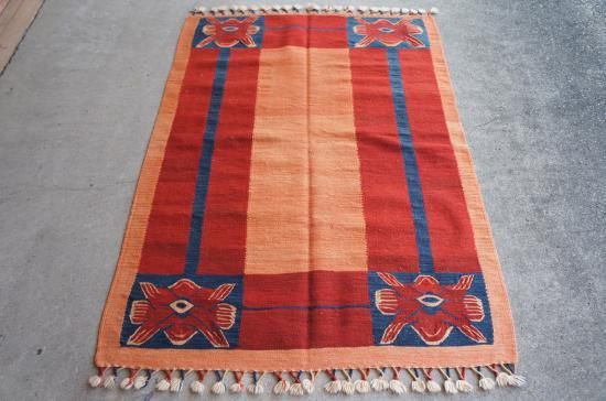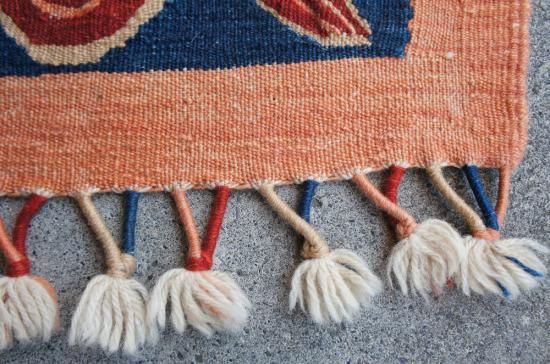 【お手入】 普段のお手入れは掃除機をかけるだけで十分です。また、天気の良い場所に干したり、敷き場所や方向など定期的に変えたりする事も長持ちの秘訣です。汚れが気になったら水洗いもできます。その際は、お湯を使わず水で洗って下さい。夏に屋外で洗う場合、ホースに残っている水は熱くなっていますので、水の温度になってから洗って下さい。ご自分で洗うのが大変だという方には、専門店でのクリーニングをお勧めします。当店でも承りますのでご相談ください。また、長期間使用しないまま保管される場合は、汚れをとり、湿気のない風通しの良い場所に保管して下さい。手織りの絨毯、キリムはお手入れ次第で一生あるいは次の世代まで受け継いでいただけます。