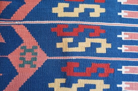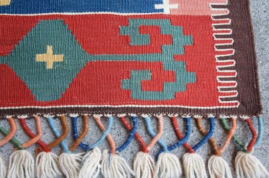 【お手入】 普段のお手入れは掃除機をかけるだけで十分です。また、天気の良い場所に干したり、敷き場所や方向など定期的に変えたりする事も長持ちの秘訣です。汚れが気になったら水洗いもできます。その際は、お湯を使わず水で洗って下さい。夏に屋外で洗う場合、ホースに残っている水は熱くなっていますので、水の温度になってから洗って下さい。ご自分で洗うのが大変だという方には、専門店でのクリーニングをお勧めします。当店でも承りますのでご相談ください。また、長期間使用しないまま保管される場合は、汚れをとり、湿気のない風通しの良い場所に保管して下さい。手織りの絨毯、キリムはお手入れ次第で一生あるいは次の世代まで受け継いでいただけます。