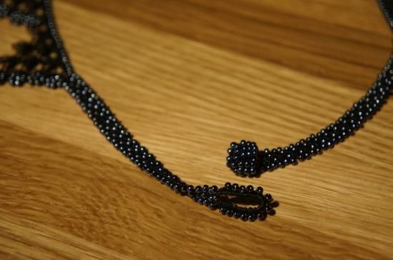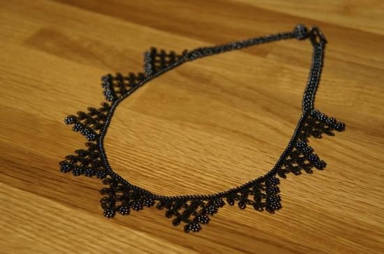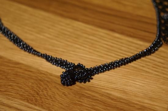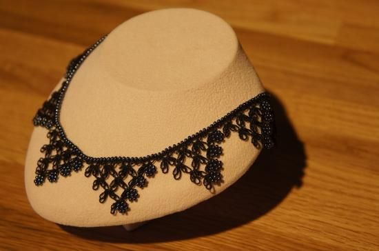 ◇特 徴◇ ブラックの糸とビーズで編んだ、上品な雰囲気のネックレス。フォーマルなファッションにも使えそうな作品です。糸とビーズでできているから見た目の華やかさからは想像できないほど軽く、金属を使わないので金属アレルギーという方にもおすすめです。お洒落上手な方へのプレゼントにも喜ばれそうですね。