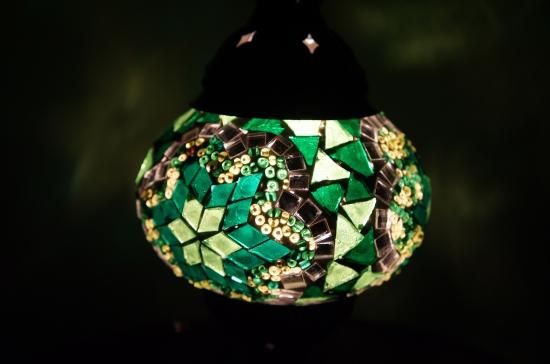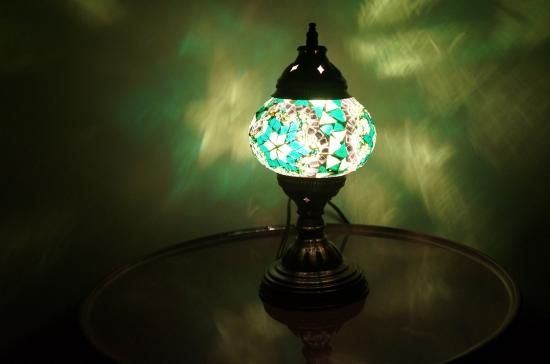 カットしたガラスやビーズを使いいろいろな模様を作っていくトルコのモザイクランプ。ガラス球にビーズでくるくると渦巻き模様を作ったり、ビーズやカットガラスを散りばめて貼り付けています。光を放つことにより、お部屋の壁や天井に模様を映し出し、エキゾチックな空間にしてくれます。使用している電球は海外仕様になりますが日本でも購入可能です(当店でも販売はしております。)