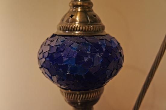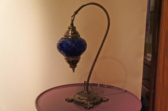 神秘的な青い光を放つ、釣鐘タイプのモザイクランプ。