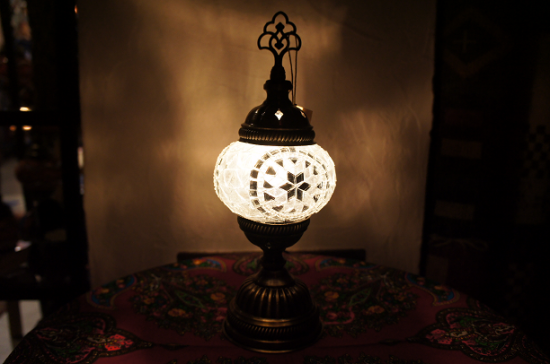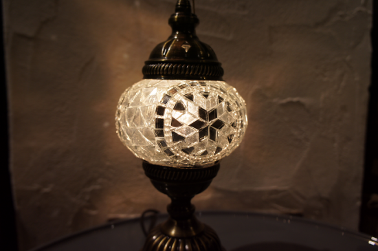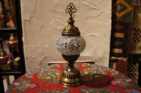 カットしたガラスやビーズを使いいろいろな模様を作っていくトルコのモザイクランプ。ガラス球にビーズでくるくると渦巻き模様を作ったり、ビーズやカットガラスを散りばめて貼り付けています。光を放つことにより、お部屋の壁や天井に模様を映し出し、エキゾチックな空間にしてくれます。使用している電球は海外仕様になりますが日本でも購入可能です(当店でも販売はしております。)