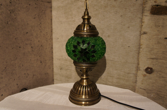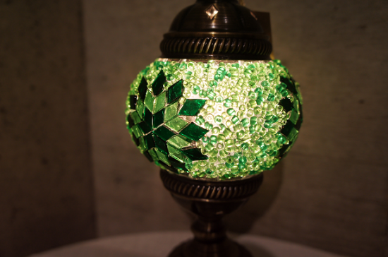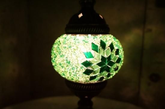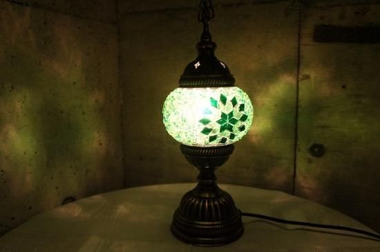 カットしたガラスやビーズを使いいろいろな模様を作っていくトルコのモザイクランプ。ガラス球にビーズでくるくると渦巻き模様を作ったり、ビーズやカットガラスを散りばめて貼り付けています。光を放つことにより、お部屋の壁や天井に模様を映し出し、エキゾチックな空間にしてくれます。使用している電球は海外仕様になりますが日本でも購入可能です(当店でも販売はしております。)
