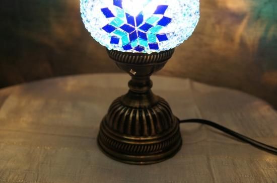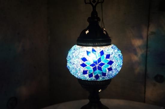カットしたガラスやビーズを使いいろいろな模様を作っていくトルコのモザイクランプ。ガラス球にビーズでくるくると渦巻き模様を作ったり、ビーズやカットガラスを散りばめて貼り付けています。光を放つことにより、お部屋の壁や天井に模様を映し出し、エキゾチックな空間にしてくれます。使用している電球は海外仕様になりますが日本でも購入可能です(当店でも販売はしております。)