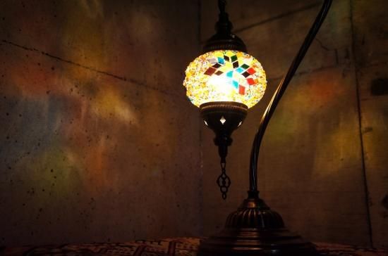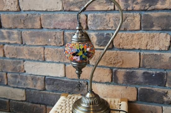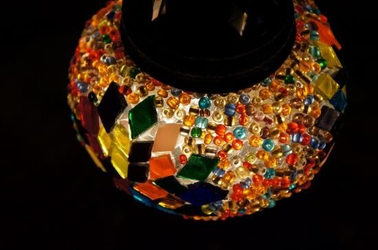カットしたガラスやビーズを使いいろいろな模様を作っていくトルコのモザイクランプ。ガラス球にビーズでくるくると渦巻き模様を作ったり、ビーズやカットガラスを散りばめて貼り付けています。光を放つことにより、お部屋の壁や天井に模様を映し出し、エキゾチックな空間にしてくれます。使用している電球は海外仕様になりますが日本でも購入可能です(当店でも販売はしております。)