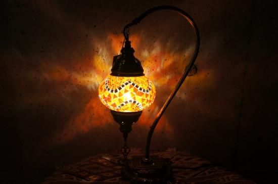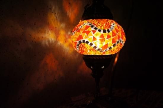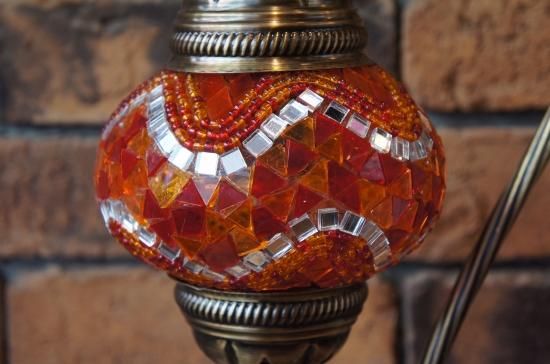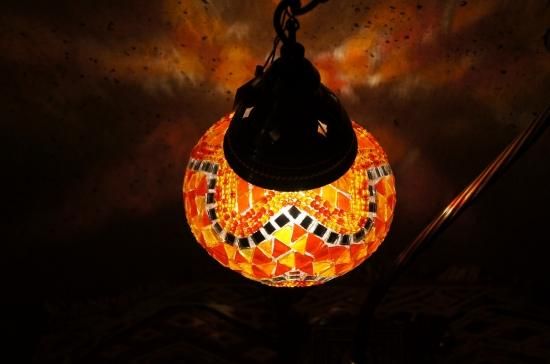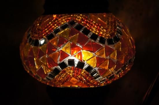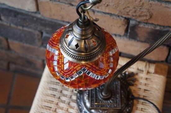 カットしたガラスやビーズを使いいろいろな模様を作っていくトルコのモザイクランプ。ガラス球にビーズでくるくると渦巻き模様を作ったり、ビーズやカットガラスを散りばめて貼り付けています。光を放つことにより、お部屋の壁や天井に模様を映し出し、エキゾチックな空間にしてくれます。使用している電球は海外仕様になりますが日本でも購入可能です(当店でも販売はしております。)