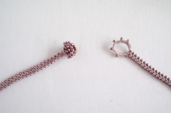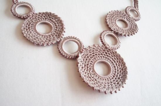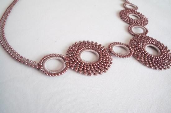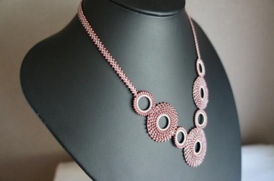 上品な薄いピンク色の糸とビーズの組み合わせで編んだネックレス。糸とビーズでできているから見た目の華やかさからは想像できないほど軽く、金属を使わないので金属アレルギーという方にもおすすめです。お洒落上手な方へのプレゼントにも喜ばれそうですね。