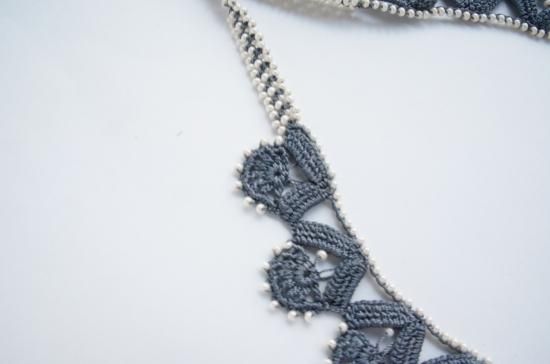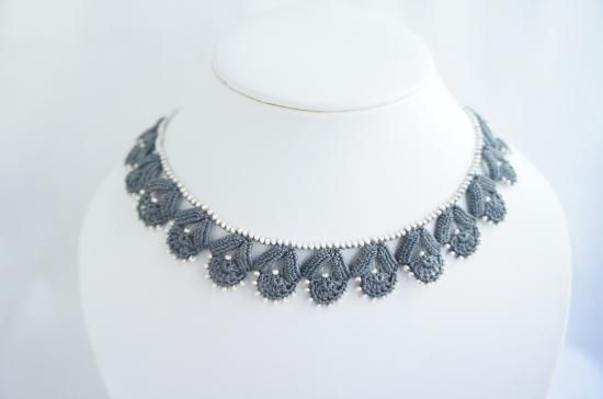 ◇特 徴◇ 灰青色の糸と白いビーズの組み合わせで編んだネックレス。糸とビーズでできているから見た目の華やかさからは想像できないほど軽く、金属を使わないので金属アレルギーという方にもおすすめです。お洒落上手な方へのプレゼントにも喜ばれそうですね。