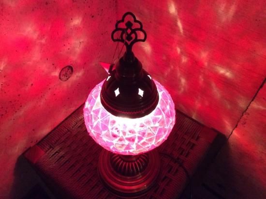カットしたガラスやビーズを使いいろいろな模様を作っていくトルコのモザイクランプ。ガラス球に、ビーズやカットガラスを散りばめて貼り付けています。光を放つことにより、お部屋の壁や天井に模様を映し出し、エキゾチックな空間にしてくれます。使用している電球は海外仕様になりますが日本でも購入可能です(当店でも販売はしております。)