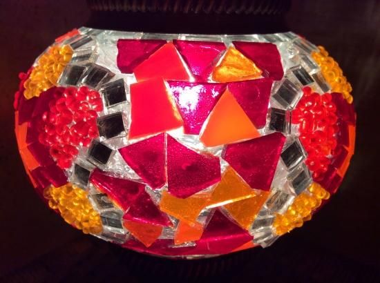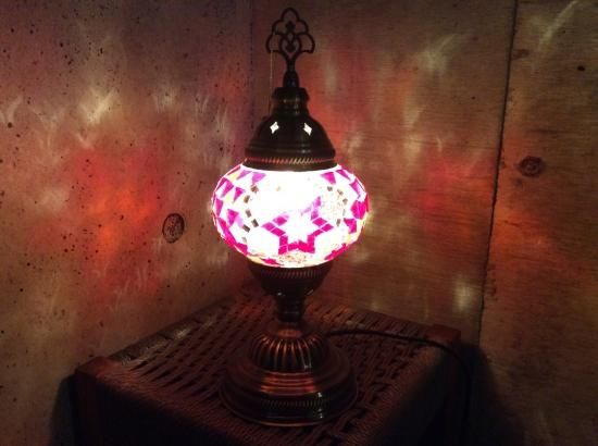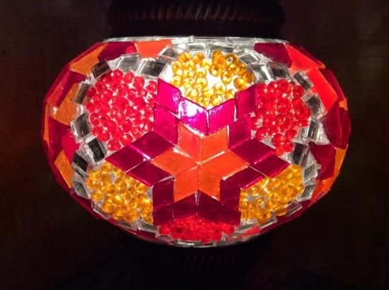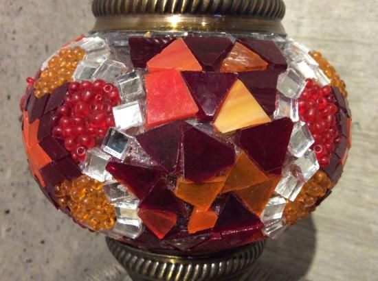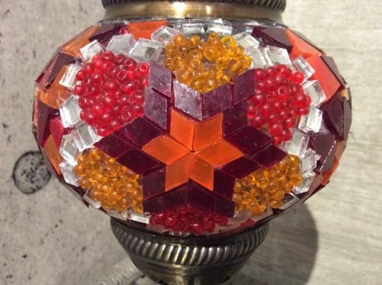 カットしたガラスやビーズを使いいろいろな模様を作っていくトルコのモザイクランプ。ガラス球に、ビーズやカットガラスを散りばめて貼り付けています。光を放つことにより、お部屋の壁や天井に模様を映し出し、エキゾチックな空間にしてくれます。使用している電球は海外仕様になりますが日本でも購入可能です(当店でも販売はしております。)