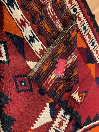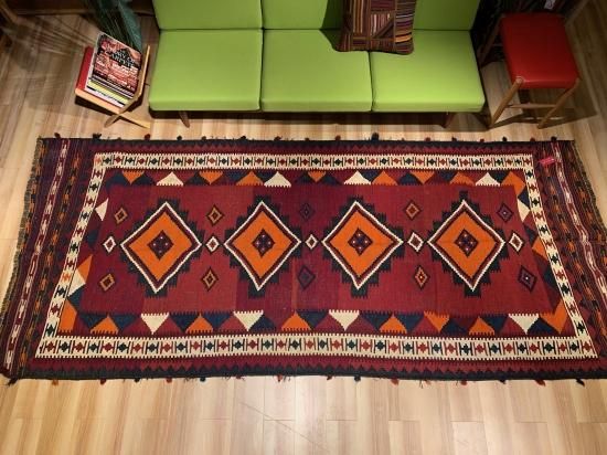 【お手入】 普段のお手入れは掃除機をかけるだけで十分です。天気の良い場所に干したり、敷き場所や方向など定期的に変えたりする事も長持ちの秘訣です。汚れが気になりクリーニングをお考えの場合には、専門店でのクリーニングをお勧めします。当店でも承りますのでご相談ください。また、長期間使用しないまま保管される場合は、汚れをとり、湿気のない風通しの良い場所に保管して下さい。手織りのキリムはお手入れ次第で一生あるいは次の世代まで受け継いでいただけます。