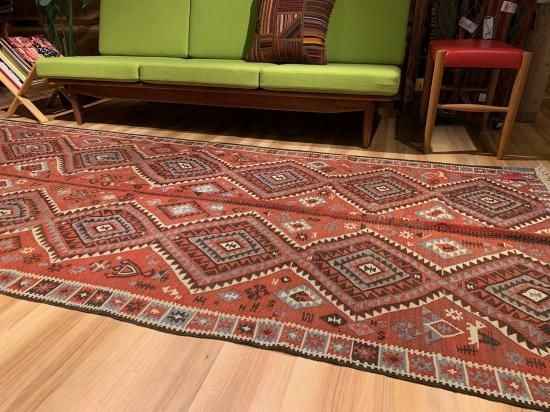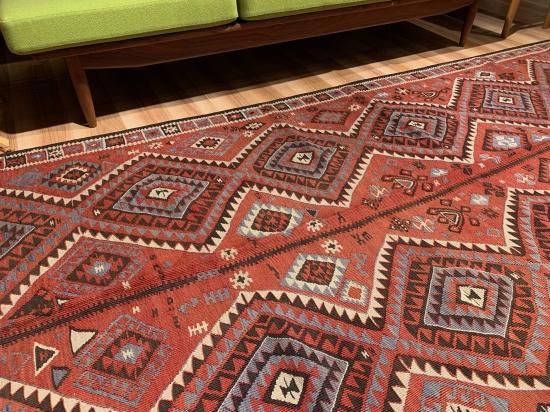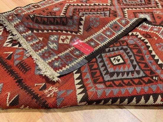【お手入】 普段のお手入れは掃除機をかけるだけで十分です。天気の良い場所に干したり、敷き場所や方向など定期的に変えたりする事も長持ちの秘訣です。汚れが気になりクリーニングをお考えの場合には、専門店でのクリーニングをお勧めします。当店でも承りますのでご相談ください。また、長期間使用しないまま保管される場合は、汚れをとり、湿気のない風通しの良い場所に保管して下さい。手織りのキリムはお手入れ次第で一生あるいは次の世代まで受け継いでいただけます。
