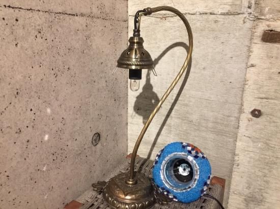 ブルーと透明のカットガラスとビーズのランプ。明るい光を放ちます。