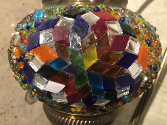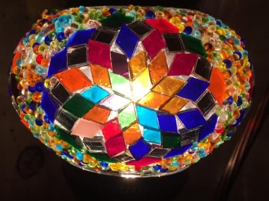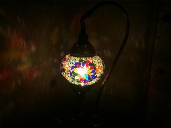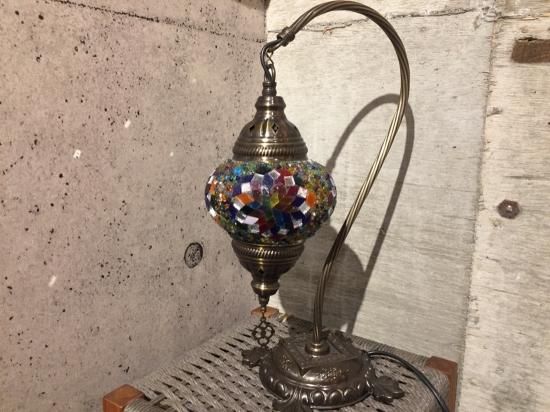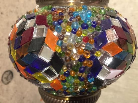 カットしたガラスやビーズを使いいろいろな模様を作っていくトルコのモザイクランプ。ガラス球にビーズでくるくると渦巻き模様を作ったり、ビーズやカットガラスを散りばめて貼り付けています。光を放つことにより、お部屋の壁や天井に模様を映し出し、エキゾチックな空間にしてくれます。使用している電球は海外仕様になりますが日本でも購入可能です(当店でも販売はしております。)