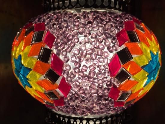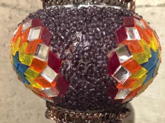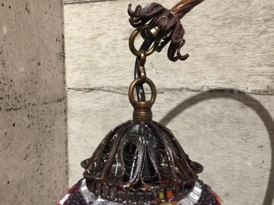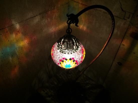 カットしたガラスやビーズを使いいろいろな模様を作っていくトルコのモザイクランプ。ガラス球にビーズでくるくると渦巻き模様を作ったり、ビーズやカットガラスを散りばめて貼り付けています。光を放つことにより、お部屋の壁や天井に模様を映し出し、エキゾチックな空間にしてくれます。使用している電球は海外仕様になりますが日本でも購入可能です(当店でも販売はしております。)