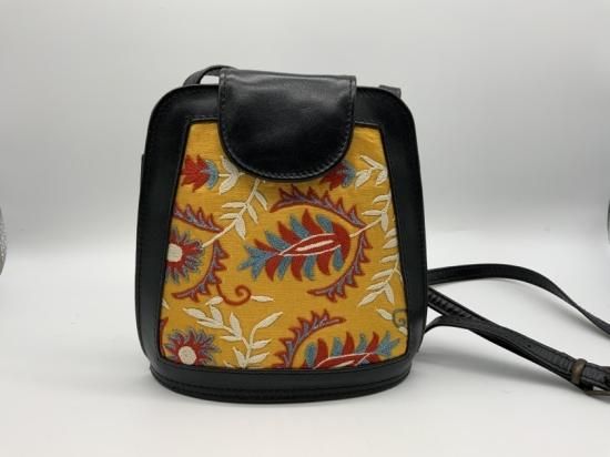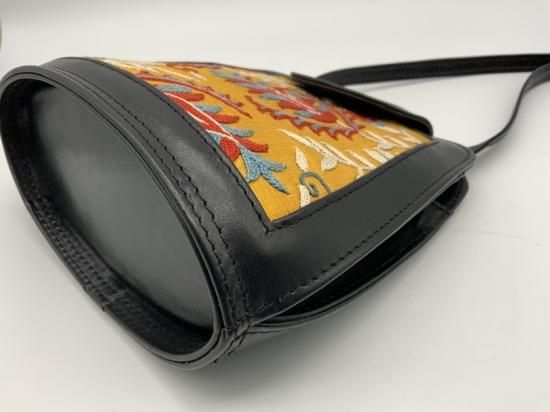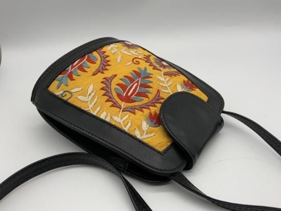 中央アジア遊牧民に伝わる刺繍をほどこした布と本革を使用したバッグです。