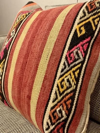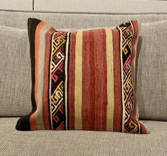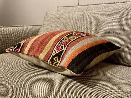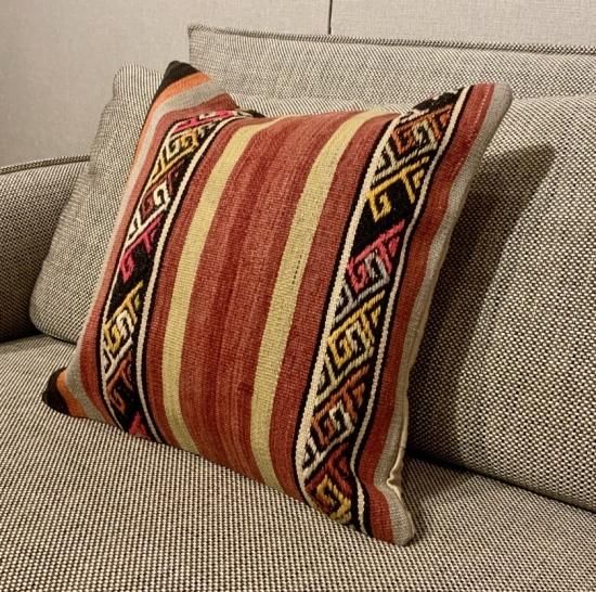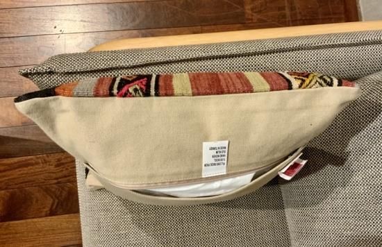 何十年も前に織られたオールドキリムの状態の良い部分をカットしてキリムのクッションカバーにしました。何回も洗い、日に当ててこそ出てくる色合い風合いに趣きを感じます。ソファーにいくつか並べてお洒落にディスプレイしてみてはいかがでしょう。