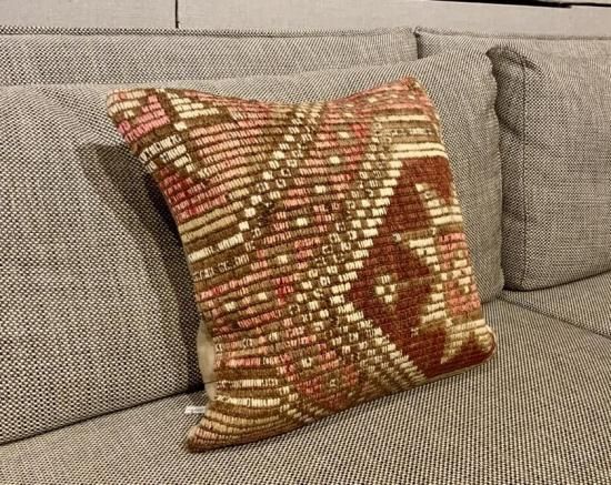 何十年も前に織られたオールドキリムの状態の良い部分をカットしてキリムのクッションカバーにしました。何回も洗い、日に当ててこそ出てくる色合い風合いに趣きを感じます。ソファーにいくつか並べてお洒落にディスプレイしてみてはいかがでしょう。