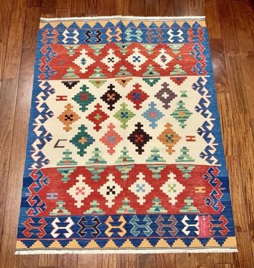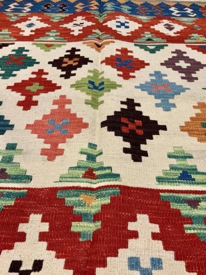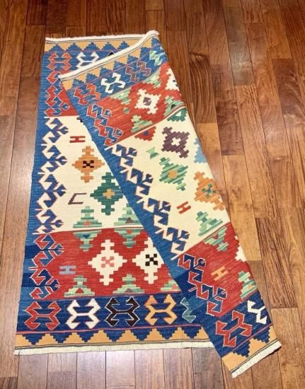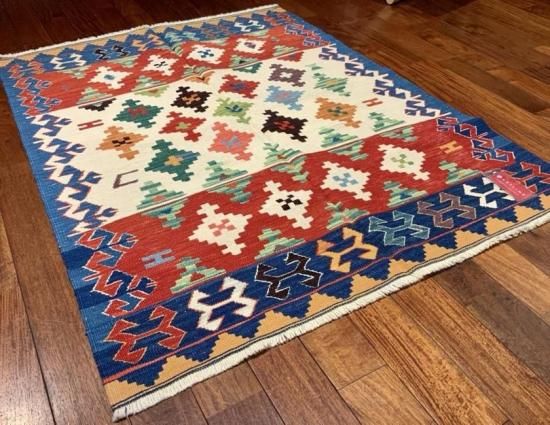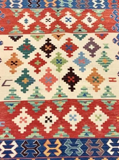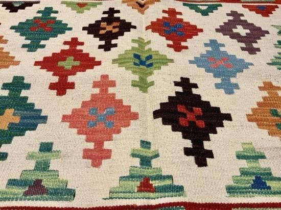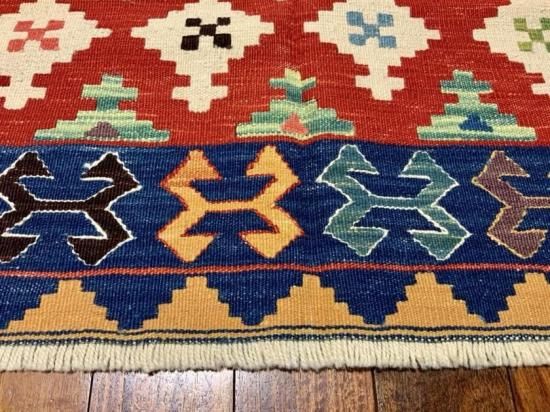 【お手入】 普段のお手入れは掃除機をかけるだけで十分です。また、天気の良い場所に干したり、敷き場所や方向など定期的に変えたりする事も長持ちの秘訣です。汚れが気になったら水洗いもできます。その際は、お湯を使わず水で洗って下さい。夏に屋外で洗う場合、ホースに残っている水は熱くなっていますので、水の温度になってから洗って下さい。ご自分で洗うのが大変だという方には、専門店でのクリーニングをお勧めします。当店でも承りますのでご相談ください。また、長期間使用しないまま保管される場合は、汚れをとり、湿気のない風通しの良い場所に保管して下さい。手織りの絨毯、キリムはお手入れ次第で一生あるいは次の世代まで受け継いでいただけます。