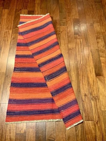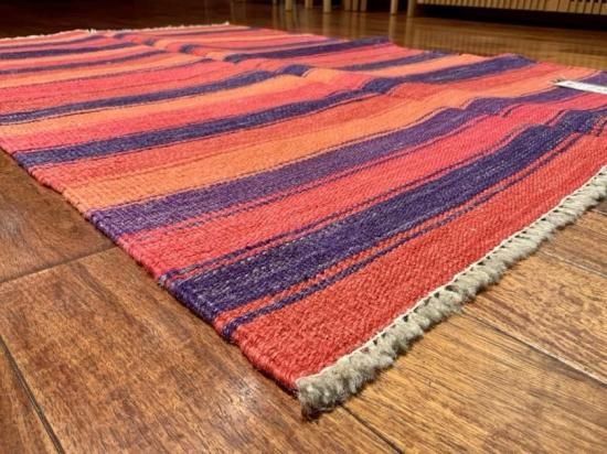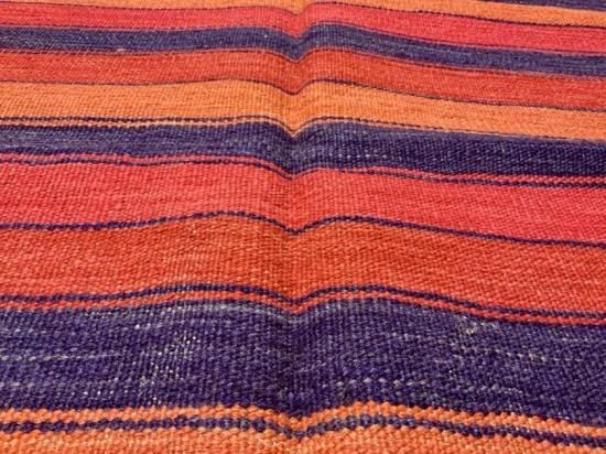 イランカシュガイ族が草木染・手織りで織り上げる平織のキリムです。遊牧民にとってキリムは穀物袋やラクダの背中に乗せる袋など生活用具を作る生地としての役割があり、家族の幸せを願うデザインが施されています。