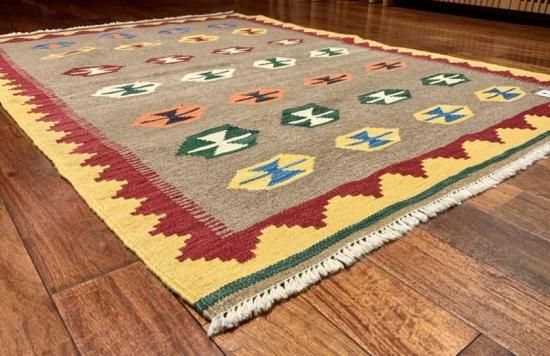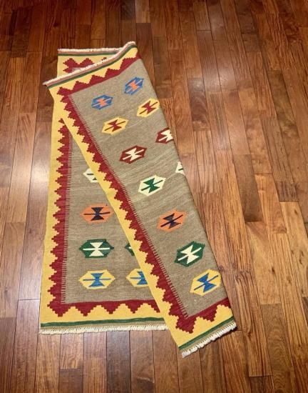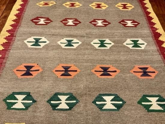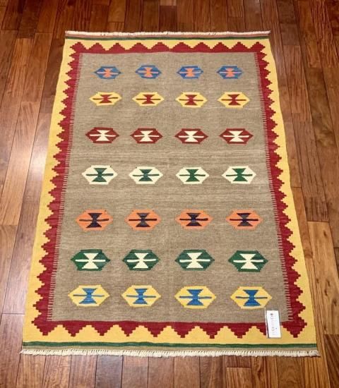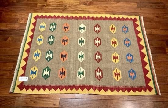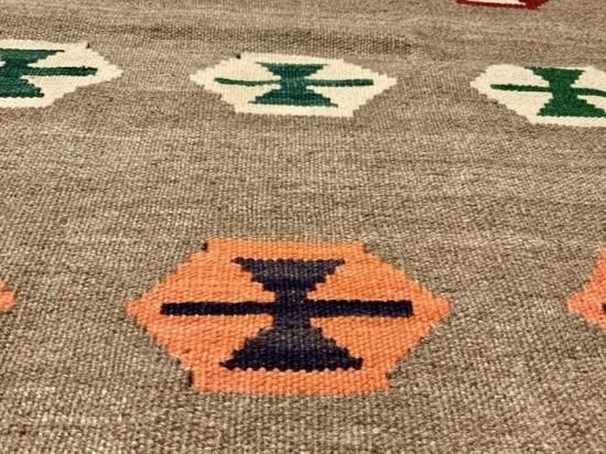 イランカシュガイ族が草木染・手織りで織り上げる平織のキリムです。遊牧民にとってキリムは穀物袋やラクダの背中に乗せる袋など生活用具を作る生地としての役割があり、家族の幸せを願うデザインが施されています。