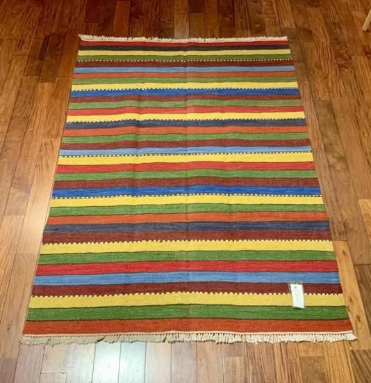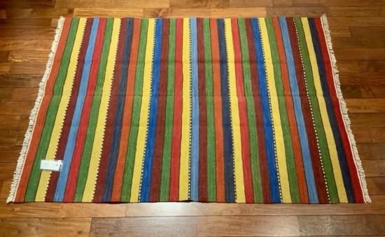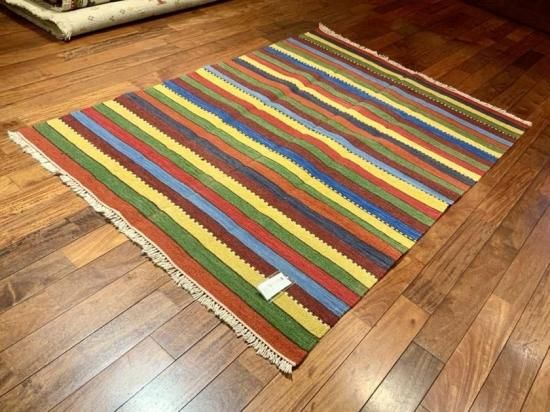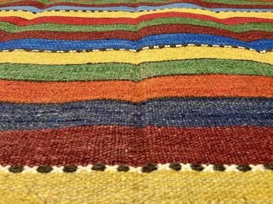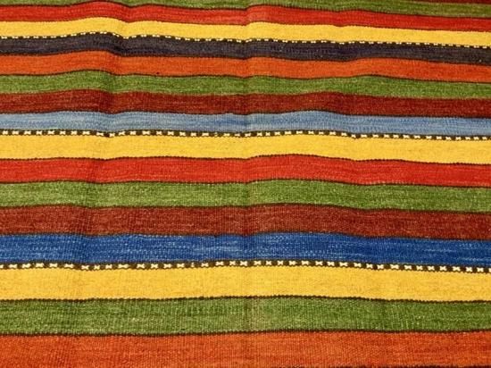 イランカシュガイ族が草木染・手織りで織り上げる平織のキリムです。遊牧民にとってキリムは穀物袋やラクダの背中に乗せる袋など生活用具を作る生地としての役割があり、家族の幸せを願うデザインが施されています。