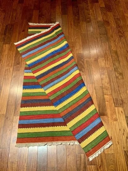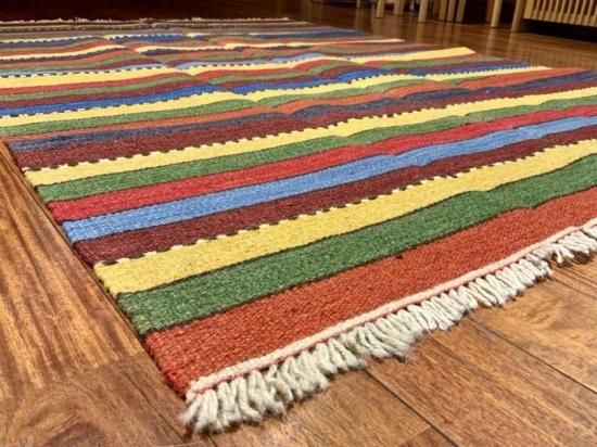【お手入】 普段のお手入れは掃除機をかけるだけで十分です。また、天気の良い場所に干したり、敷き場所や方向など定期的に変えたりする事も長持ちの秘訣です。汚れが気になったら水洗いもできます。その際は、お湯を使わず水で洗って下さい。夏に屋外で洗う場合、ホースに残っている水は熱くなっていますので、水の温度になってから洗って下さい。ご自分で洗うのが大変だという方には、専門店でのクリーニングをお勧めします。当店でも承りますのでご相談ください。また、長期間使用しないまま保管される場合は、汚れをとり、湿気のない風通しの良い場所に保管して下さい。手織りの絨毯、キリムはお手入れ次第で一生あるいは次の世代まで受け継いでいただけます。