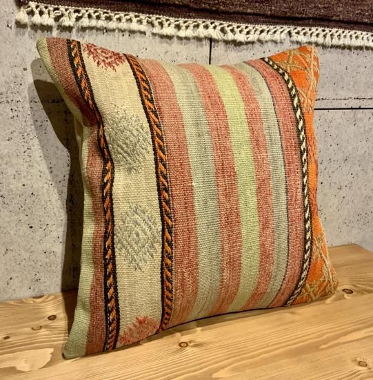 何十年も前に織られたオールドキリムの状態の良い部分をカットしてキリムのクッションカバーにしました。何回も洗い、日に当ててこそ出てくる色合い風合いに趣きを感じます。ソファーにいくつか並べてお洒落にディスプレイしてみてはいかがでしょう。